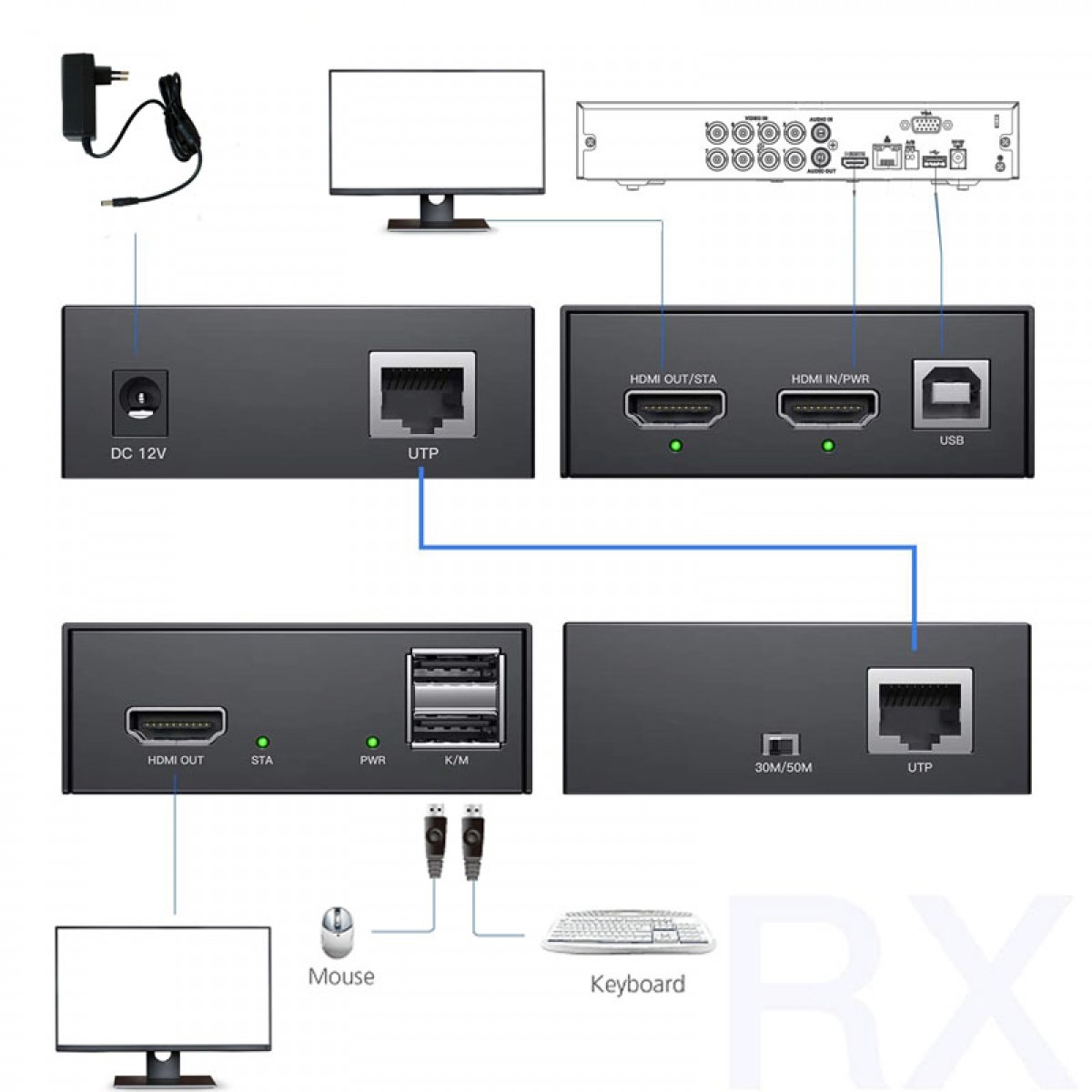 - Transmission stable jusqu’à 50 m via un câble RJ45 Cat6 ou Cat6A