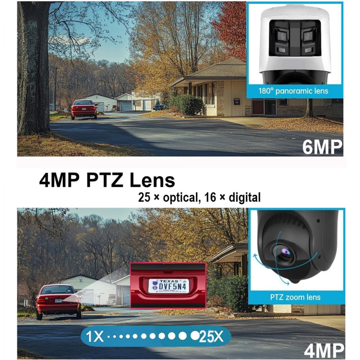- Double objectif : panoramique 6MP + PTZ 4MP