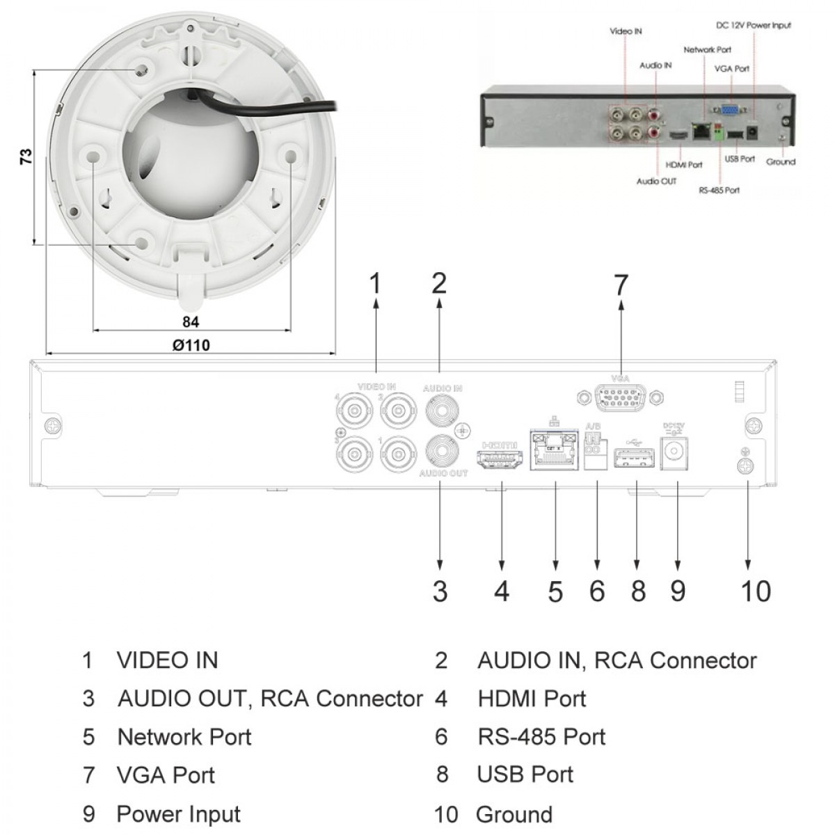 | Interface USB et RS485: | 2 x USB 2.0 pour la récuparation des vidéo sur une clé USB ou un disque dur externe. 1 x RS485 pour le contrôle du PTZ |