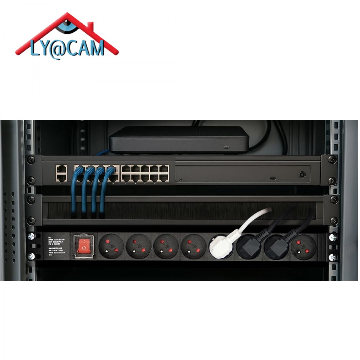 Dans une baie de brassage, on retrouve généralement plusieurs équipements : box Internet, enregistreur de vidéosurveillance, panneaux de brassage RJ45, et très souvent des switches PoE pour alimenter caméras IP, points d’accès Wi-Fi ou visiophones.