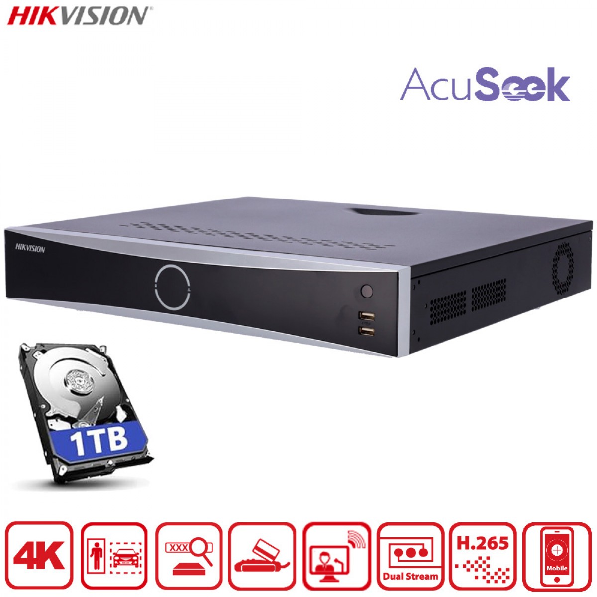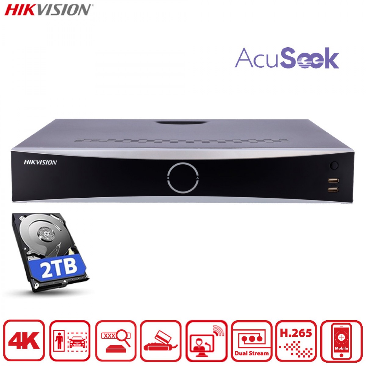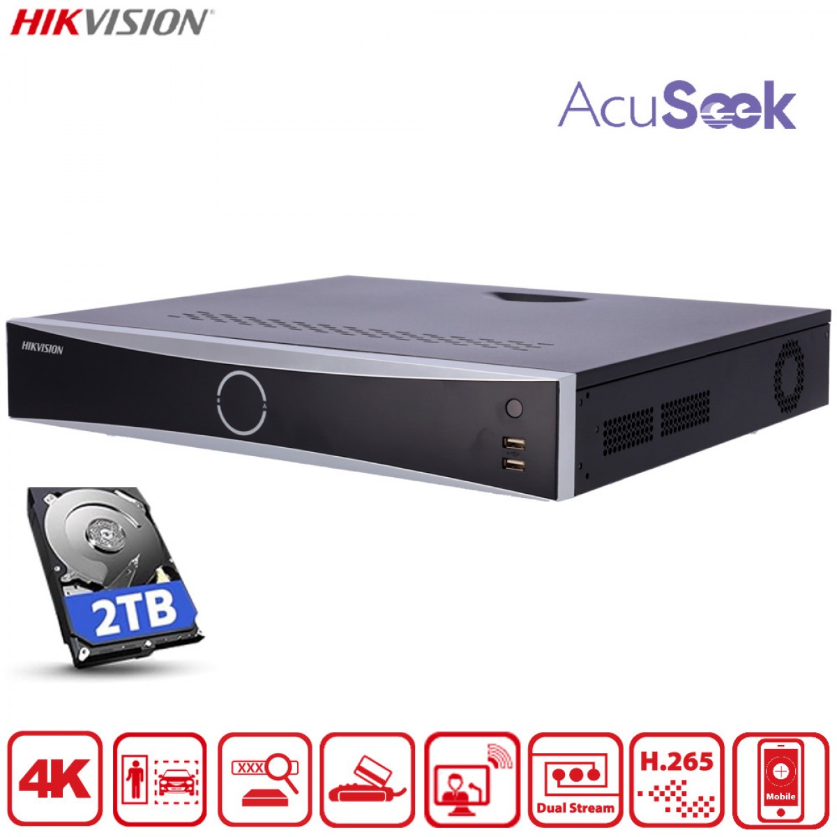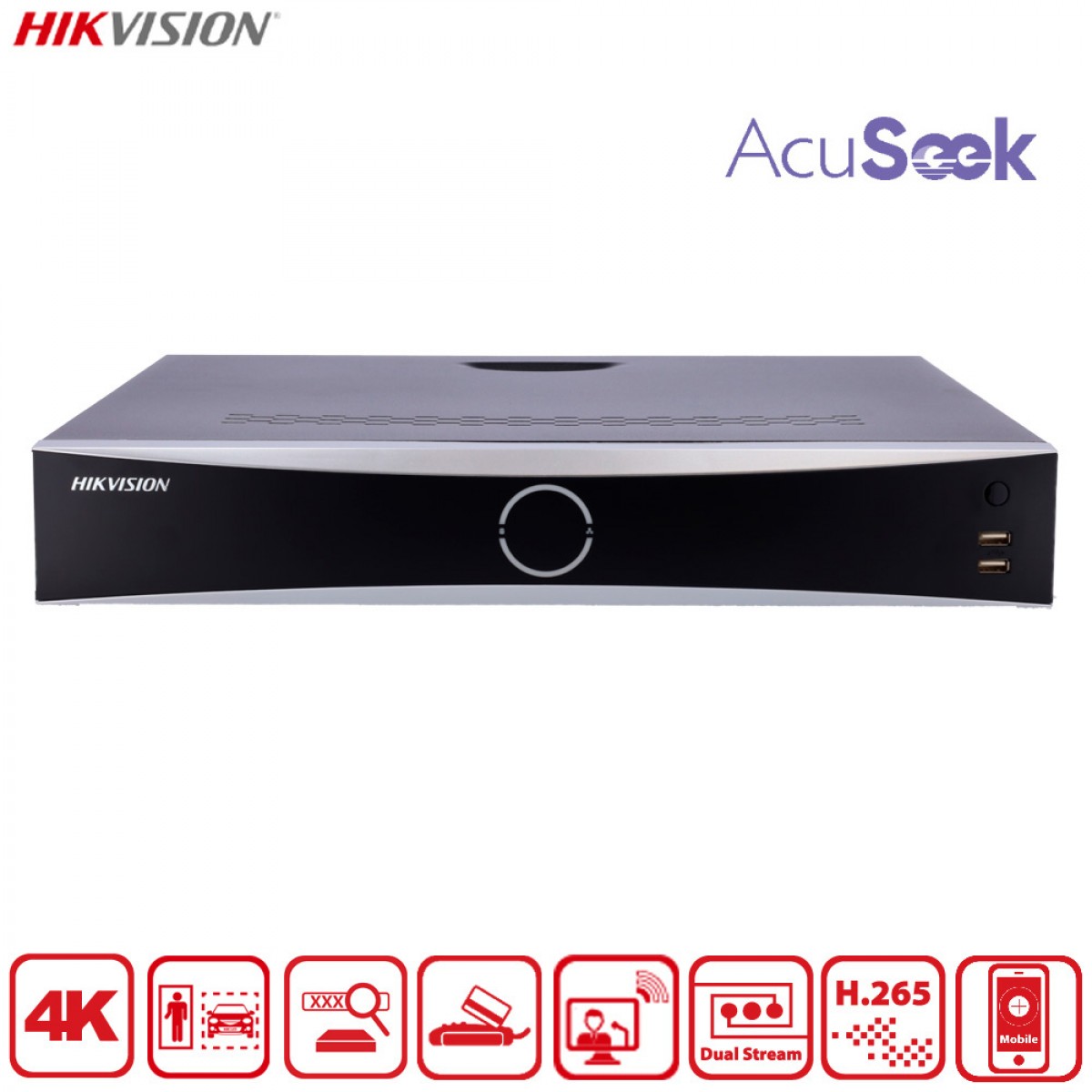 Ce NVR de la gamme VPro intègre plusieurs technologies d’intelligence artificielle développées par Hikvision : AcuSense, AcuSeek et AcuSearch. Ces fonctions permettent d’améliorer la précision des alertes et de retrouver rapidement une scène précise dans les enregistrements.