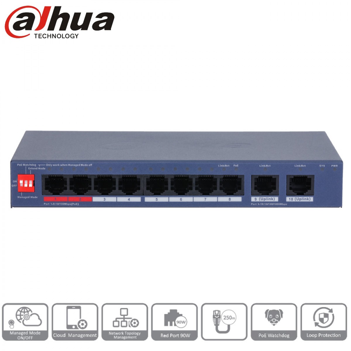 Switch PoE 8 ports Dahua + 2 ports LAN Gigabit – CS4010-8ET2GT-110