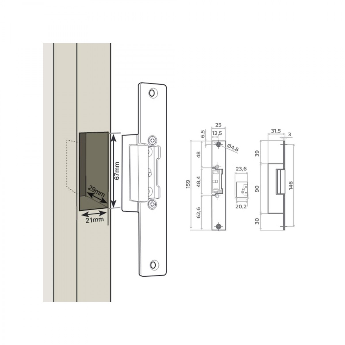 Cette gâche électrique est totalement universelle. Elle fonctionne aussi bien avec les anciennes installations qu’avec les nouveaux visiophones connectés. Pour les installations existantes, la gâche peut être alimentée via un transformateur 12V, puis reliée au contact sec du visiophone.